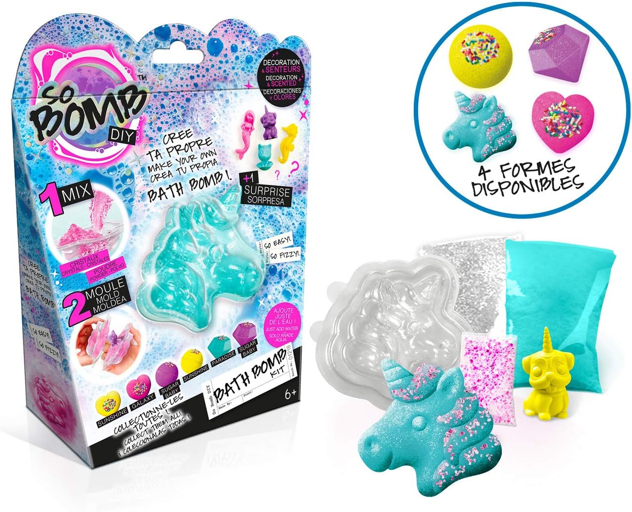 Fabrique tes bombes de bain effervescentes en mélangeant de la poudre et des décorations ; super, découvre une surprise à l'intérieur ; existe en 4 formes de moules différentes à collectionner