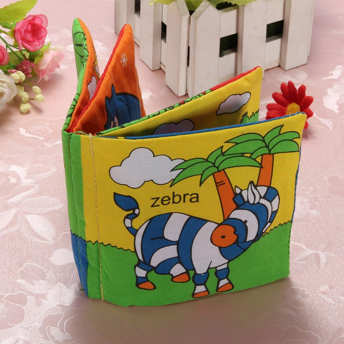 Textured fabrics and bright colors help to develop children's sensory awareness.