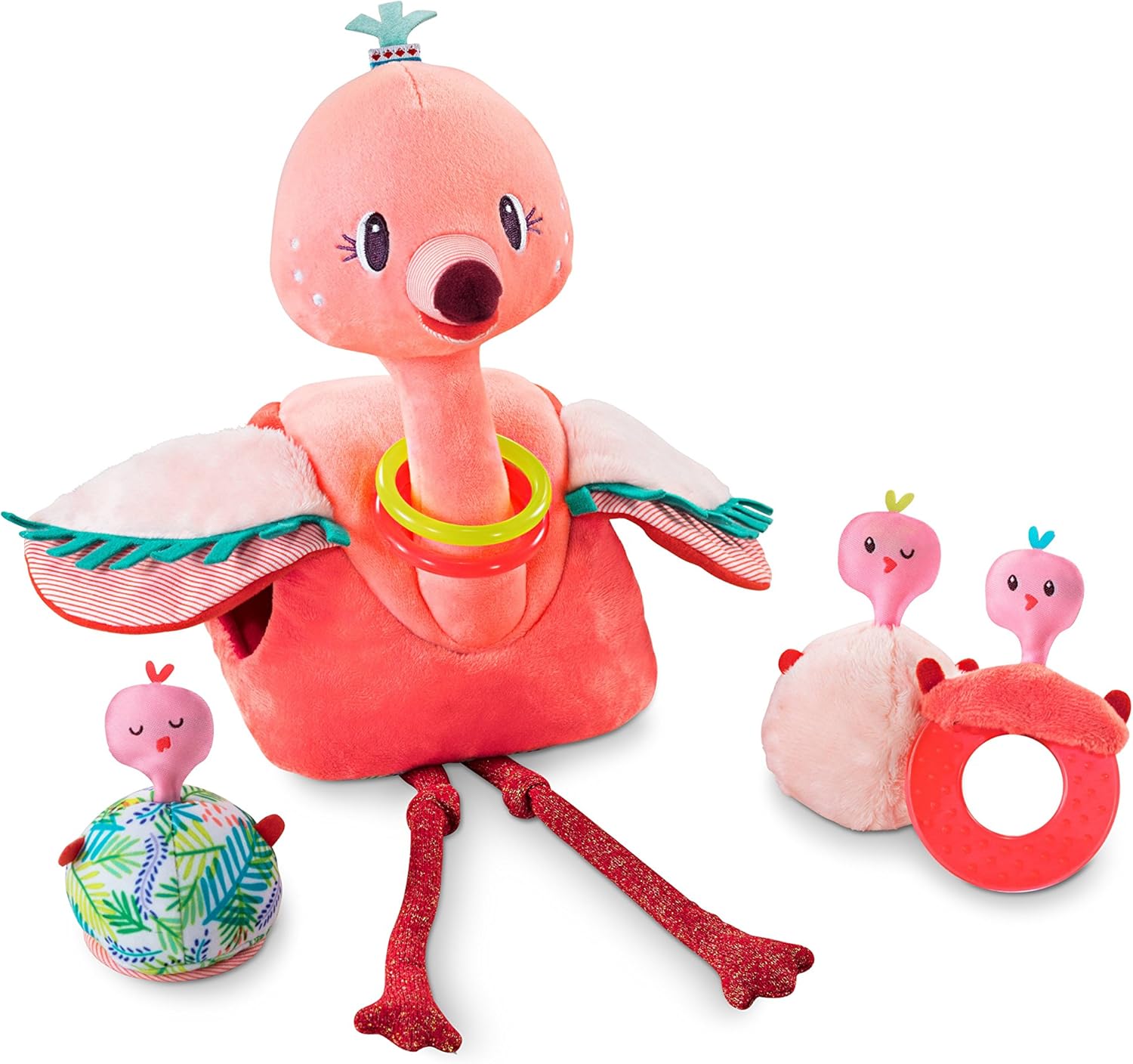 Anaïs le Flamant rose a trois bébés, tous uniques et différents. Très stimulant, ce jouet se compose d’un anneau de dentition, d’un hochet et d’un miroir. De plus ils produisent un son rigolo pour amuser et émerveiller votre bébé.